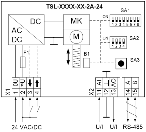 AC 24В, аналог. упр., 1000 Н, ход 20 мм, 1,5 сек/мм (откр.)/0,75 сек/мм (закр.), IP54