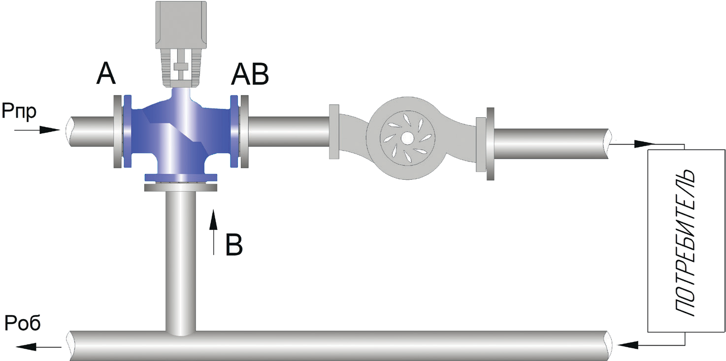 Смесительный трехходовой клапан имеет два входных патрубка (А, В) и один выходной (АВ). Применяется для качественного регулирования с поддержанием заданной температуры теплоносителя, выходящего из патрубка АВ достигается изменением пропорций между теплоносителем поступающим из патрубка А и патрубка В. Используется для смешивания двух потоков теплоносителя с разной температурой. Этот тип клапана позволяет создать поток с требуемой температурой, что необходимо для систем отопления и горячего водоснабжения. |