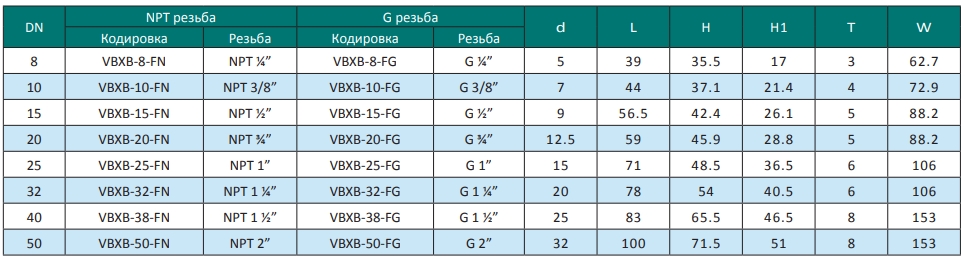 Подсоединения – внутренняя резьба 1/4”– 3”(Ду от 8 до 80 мм)