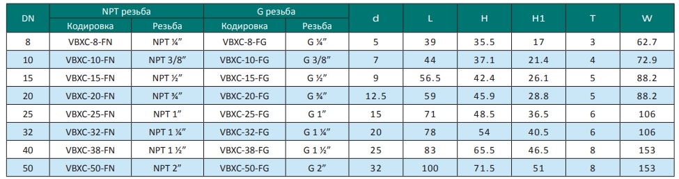 Подсоединения – внутренняя резьба 1/4”– 3”(Ду от 8 до 80 мм)