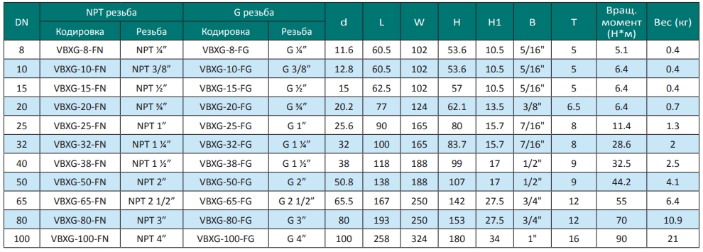 Подсоединения – внутренняя резьба 1/4”– 3”(Ду от 8 до 80 мм) Рабочее давление: 63 бар (1000 psi) Рабочая температура: от -20 до 200 C° (-4 – 392 F°) Прецизионное литье Конструкция, исключающая выбивание штока давлением среды Антистатическая конструкция (по запросу) Фиксатор ручки Резьба: NPT по ASME B1.20.1 DIN2999 & BS21 ISO7/1 & EN10226