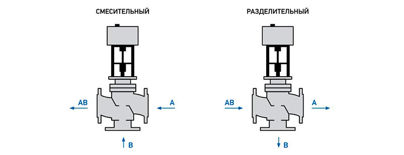 27ч908пБ/23ч901пБСмесительный трехходовой клапан имеет два входа и один выход. Применяются для качественного регулирования в системах отопления, вентиляции за счет смешения или разделения потоков теплоносителя с различной температурой. Качественное регулирование с поддержанием заданной температуры теплоносителя, выходящего из порта АВ, достигается изменением пропорций между теплоносителем, поступающим из порта А и порта В. Некоторые типы смесительных трехходовых клапанов, при соответствующей схеме установки, обеспечивают разделение потока. Разделительный трехходовой клапан (распределительный) – имеет один вход и два выхода. Применяется, как правило, для количественного регулирования за счет разделения потока теплоносителя, в схемах подогрева воды системы горячего водоснабжения, а также в узлах обвязки воздухонагревателей и воздухоохладителей. Вход распределительного клапана обозначают литерами АВ, а выходы А и В.