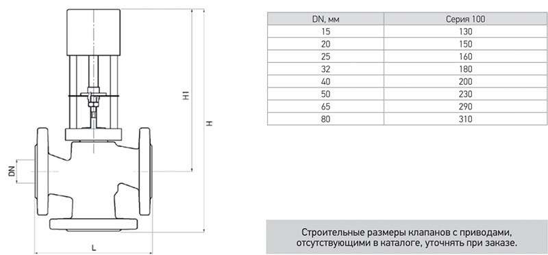 Параметры изделийПрименяемые материалыУсловная пропускная способность, Kvy, м3/чСтроительная длина, L (мм)Габаритные размеры и масса изделийПрименяемые приводы Размещение клапана на трубопроводе
