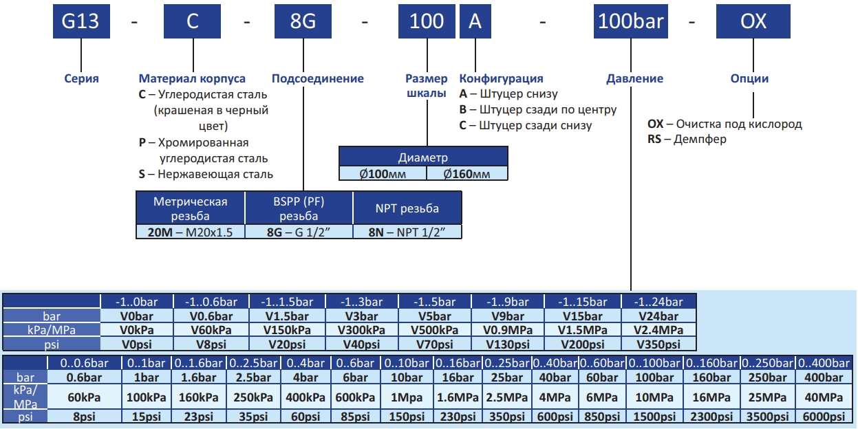 Манометр с трубкой Бурдона A-FLOW G13-C-20M-100A