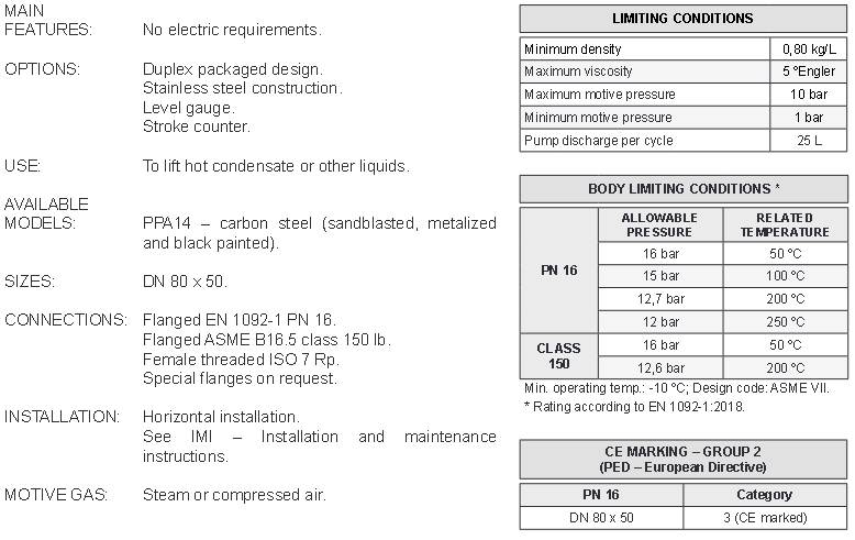 ADCAMAT PPA (насос с приводом от давления), изготовленный из карбона. сталь (нержавеющая сталь по запросу), рекомендуется при передаче высокотемпературные жидкости, такие как конденсат, масла и др., до более высокая высота или давление. При определенных условиях может опорожнять закрытую емкость под вакуумом или давление. Насос может работать от пара, сжатого воздуха или других газов,