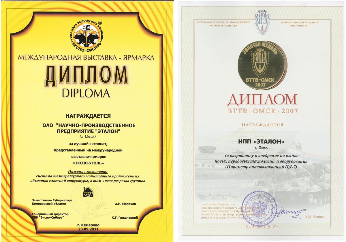 Предприятие АО НПП “Эталон” 02.09.2005г. награждено дипломом I степени за лучший экспонат пирометр оптоволоконный ПД-7, представленный на Кузбасском международном угольном форуме.