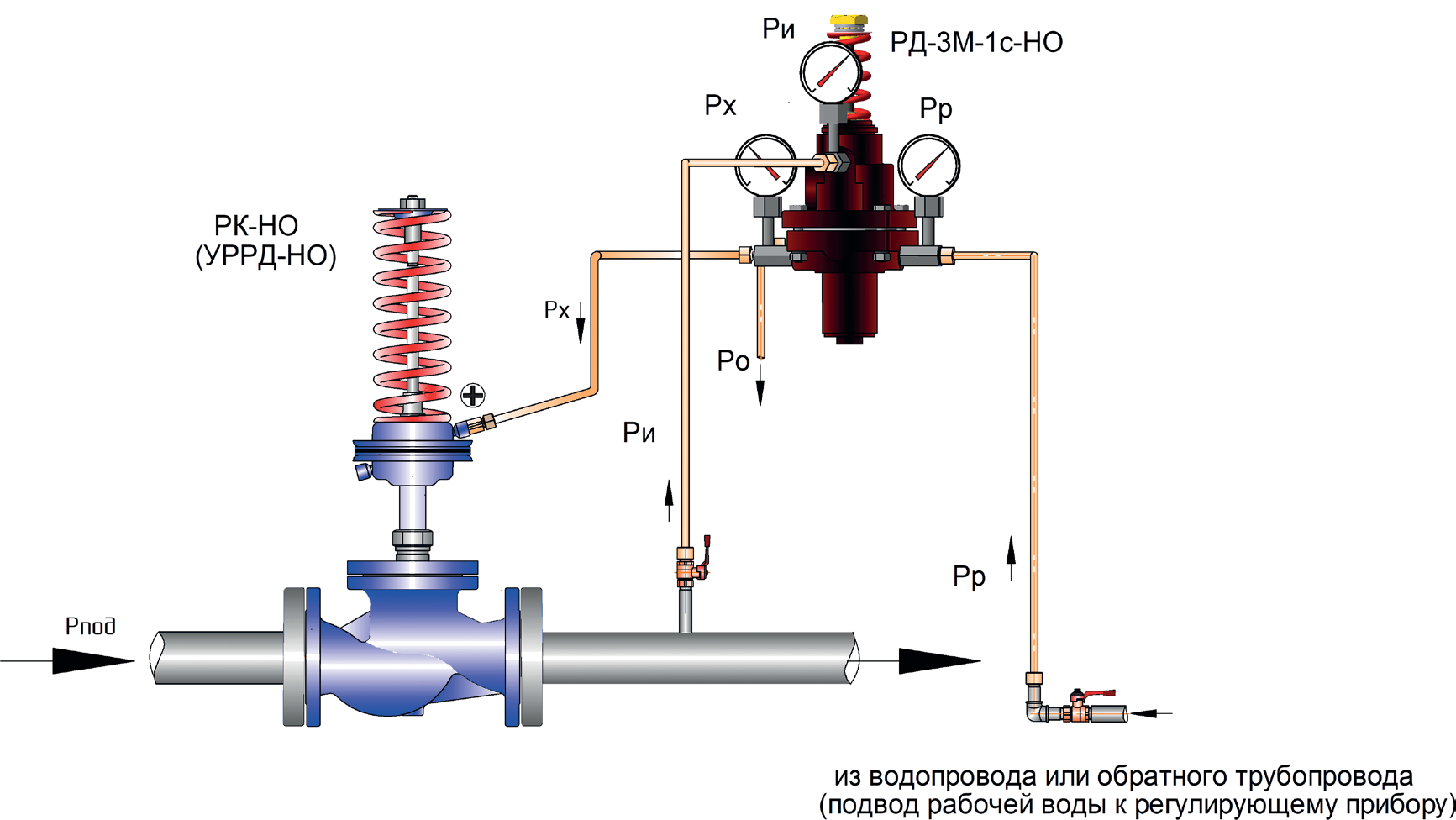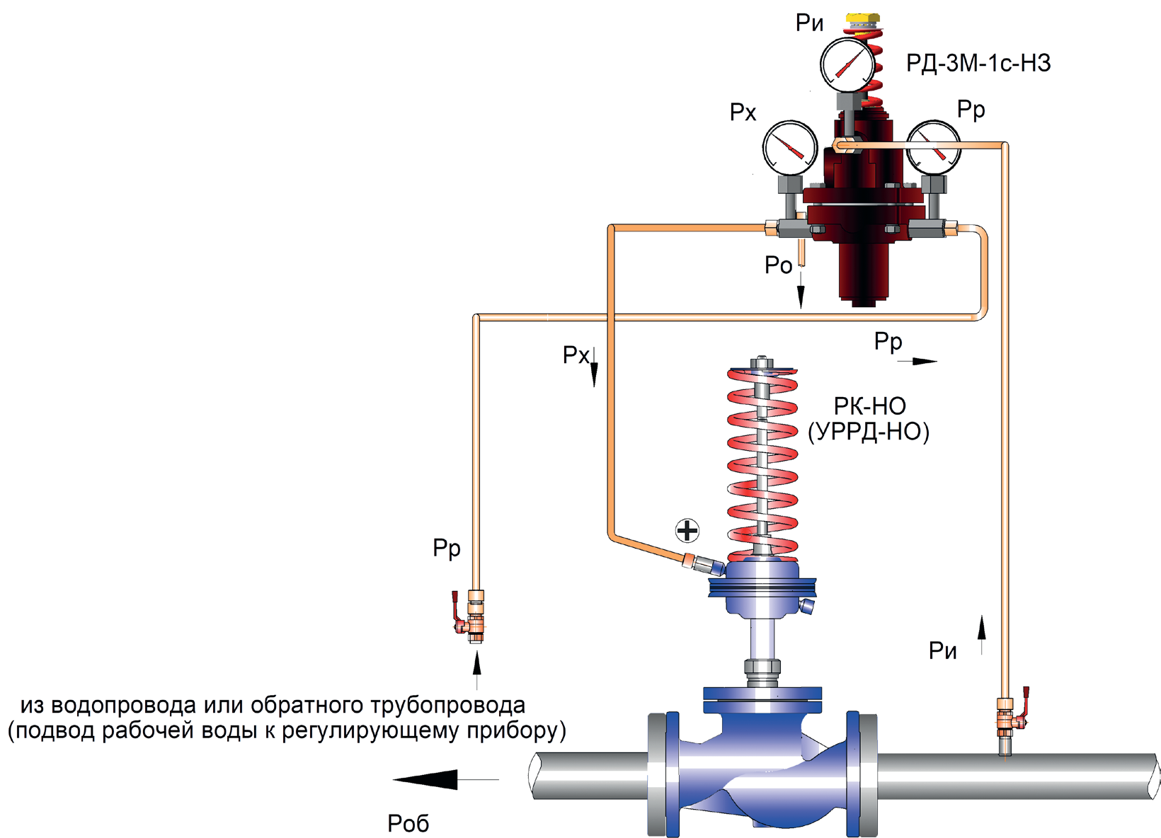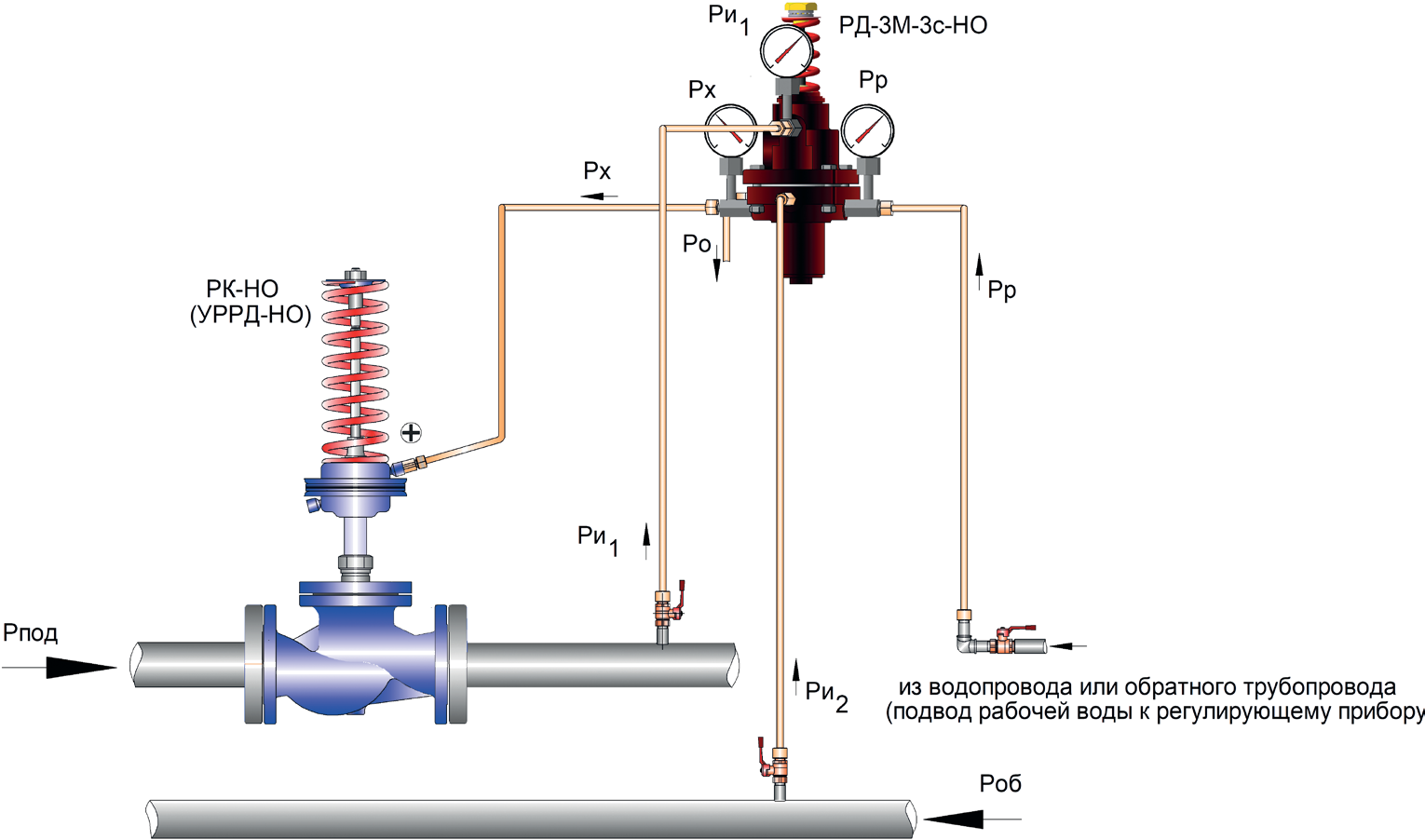 Схема регулирования давления «после себя» состоит из регулятора РД-3М-1с-НО (односильфонный с нормально открытым управляющим клапаном) и нормально открытого регулирующего клапана РК-НО. Давление из точки Ри1 поступает в импульсную камеру регулятора РД-3М, где управляющий клапан задает давление Рх на гидропривод клапана РК-НО. При увеличении давления Ри1 от заданного равновесие в импульсной камере РД-3М нарушается и подается командное давление Px, которое при помощи мембранного привода РК-НО приводит в действие плунжер и снижает давление системы до установленной (настроенной) в РД-3М величины. При снижении давления от заданного происходит сброс командного давления Рх по линии Ро, что приводит к подъему плунжера и увеличению давления системы до установленной (настроенной) в РД-3М величины |