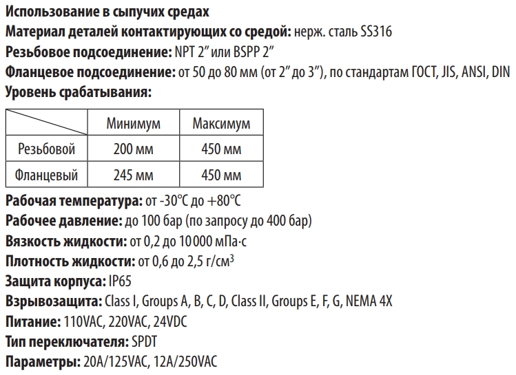 Серия L-VLS5000 представляет из себя вибрационный камертон и реле. Когда среда соприкасается с вибрирующей вилкой, то такая вибрация гасится, что и служит сигналом. Предназначен для определения уровня порошковых и гранулированных сыпучих материалов