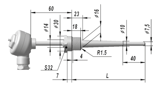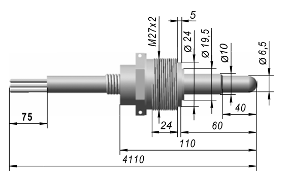 Рис.5 ТСП 9506 (Остальное см. рис. 1) Материал защитной арматуры Сталь 12Х18Н10Т Диапазон измеряемых температур: –100…+250 °С |