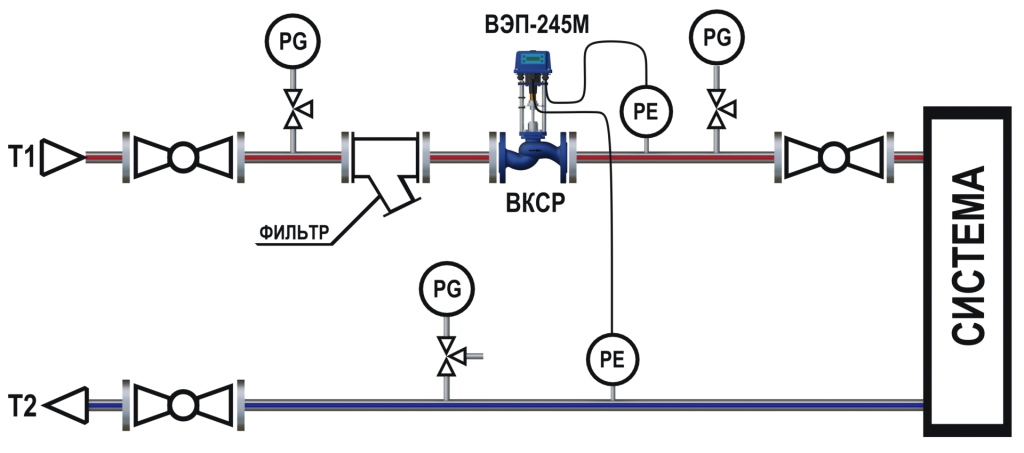 - Схема регулирования перепада давления (регулятор с функцией «перепуска») с двумя датчиками давления