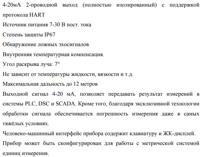 Принцип действия уровнемеров основан на измерении интервала времени между излучением высокочастотной импульсной волны по чувствительному элементу и получением отраженной волны от поверхности измеряемой среды. Конструктивно уровнемеры состоят из электронного блока размещенного в корпусе и чувствительного элемента (волновода) – стержневого, тросового, коаксиального в зависимости от модели. К электронному блоку уровнемеров подключен ЖК-дисплей, который предназначен для отображения результатов измерений, текущих настроек и конфигурирования. Уровнемеры радарные волноводные «A FLOW» серии L-RDA имеют различные исполнения: L-RDAA – для измерений уровня жидкости со стержневым или тросовым чувствительным элементом. L-RDAB – для измерений уровня жидкости с коаксиальным чувствительным элементом. L-RDAC – для измерений уровня жидкости и сыпучих веществ со стержневым или тросовым чувствительным элементом. L-RDAD – для измерений уровня жидкости и сыпучих веществ со стержневым чувствительным элементом. Настройка уровнемеров и отображение результатов измерений обеспечивается с помощью ЖК-дисплея, либо посредством аналогового выходного сигнала 4-20 мА.