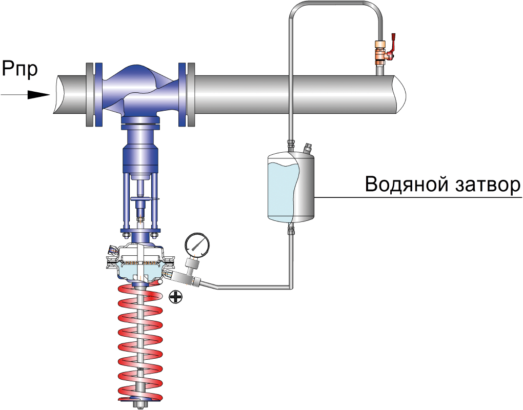 - При монтаже водяной затвор должен быть установлен выше мембранного привода регулятора.